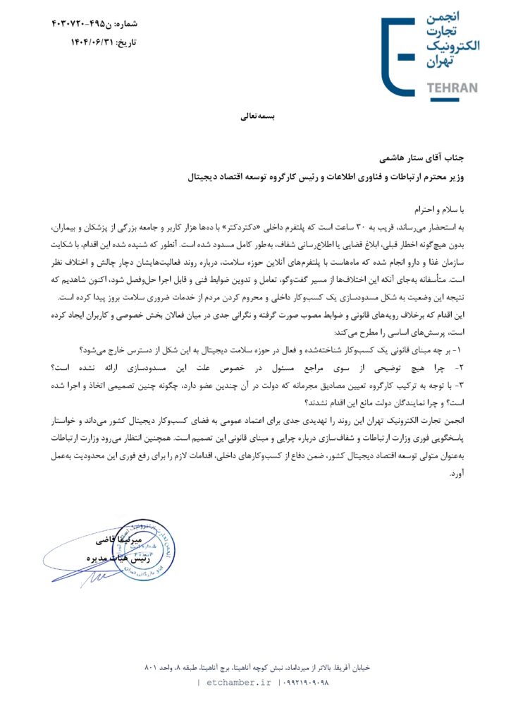 انجمن تجارت الکترونیک تهران در نامهای سرگشاده خطاب به ستار هاشمی، وزیر ارتباطات و رئیس کارگروه توسعه اقتصاد دیجیتال، نسبت به مسدودسازی ناگهانی پلتفرم «دکتر دکتر» اعتراض کرد و خواستار شفافسازی و رفع فوری این محدودیت شد.