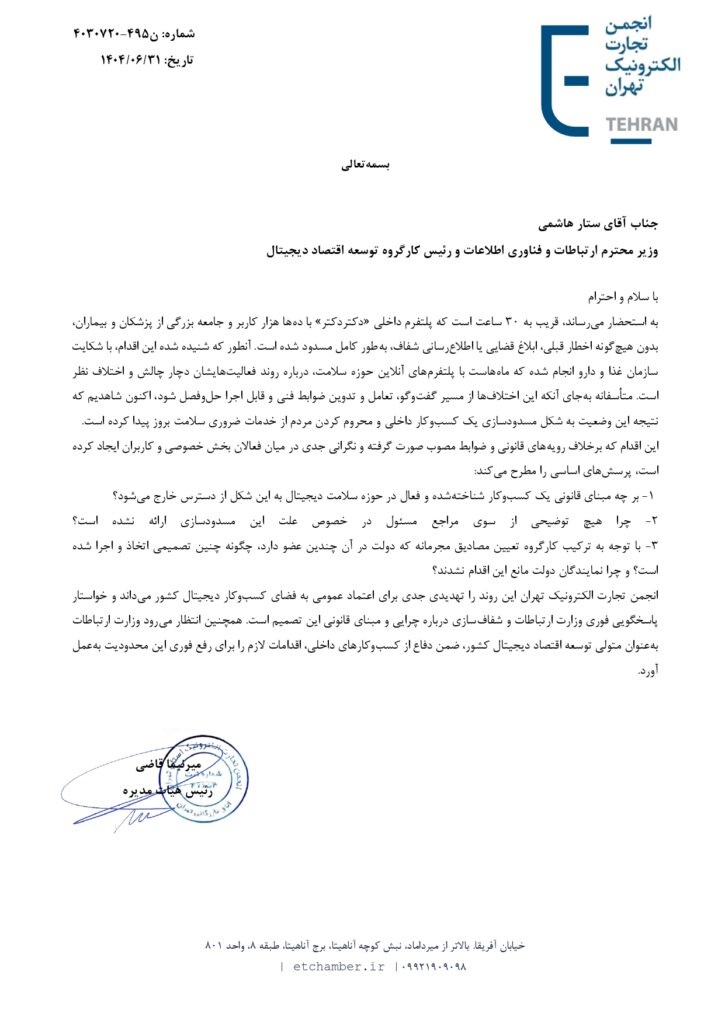The Tehran Electronic Commerce Association has issued an open letter addressed to Sattar Hashemi, Minister of Communications and Head of the Digital Economy Development Task Force, protesting the sudden blocking of the “Doctor Doctor” platform and demanding immediate clarification and removal of this restriction.