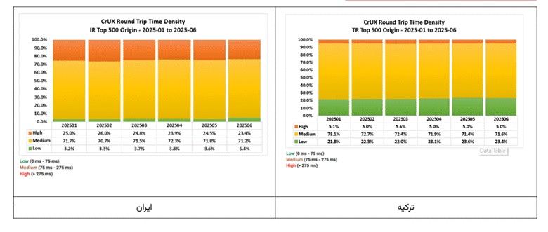 Based on Round Trip Time (RTT) analysis, Iran’s internet user experience is worse than almost all countries except a few, including Cuba, Turkmenistan, Cameroon, Angola, Sudan, Congo, and Ethiopia.